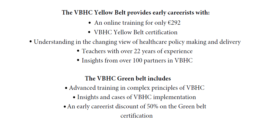 The VBHC Green Belt Track is intended for among others healthcare professionals, medical managers, early careerists, (MHA, MBA, or PhD)-students and clinical managers.